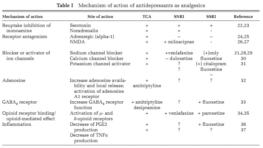 The analgesic mechanism of Cymbalta is (as with much in psychiatry) unknown. Some have argued it works by relieving the depression and anxiety experienced by patients in pain. It has also been proposed that it activates “descending” pathways from the brain, helping to dampen “ascending” pain signals from the body. It might also block NMDA receptors or sodium channels or enhance the body’s own endorphin system. (Click on the figure above for other potential mechanisms, from a recent article by Dharmshaktu et al., 2011.)