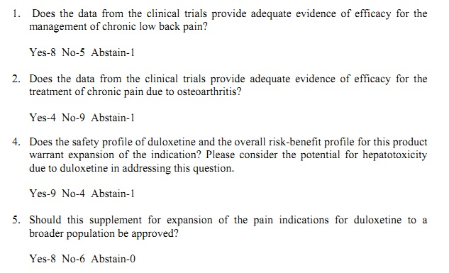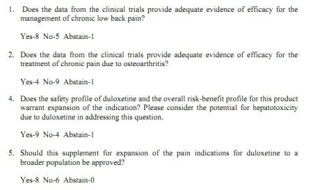 Even though the committee also complained of the “paucity of sound data regarding the pharmacological mechanisms of many analgesic drugs … and the paucity of sound data regarding the underlying pathophysiology,” they ultimately voted to approve Cymbalta for “as broad an indication as possible,” in order for “the well-informed prescriber [to] have the option of trying out an analgesic product approved for one painful condition in a patient with a similar painful condition.”